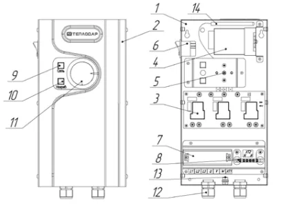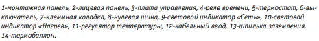 Пульт управления состоит из монтажной панели и лицевой панели. На монтажной панели размещены плата управления, реле времени, термостат, выключатель, клеммная колодка, нулевая шина. На лицевой панели пульта выведена световая индикация, регулятор температуры.