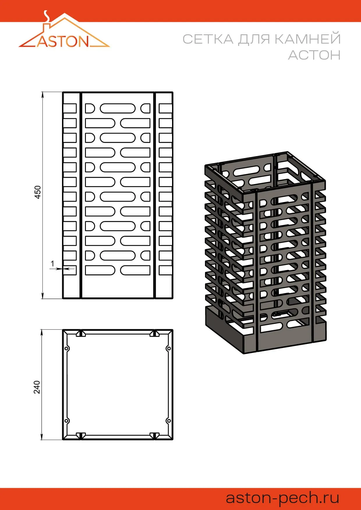 - Сетка Астон сконструирована для установки на стартовый участок дымохода банных печей Астон. Предназначена для наполнения камнями и организации дополнительной открытой каменки в районе стартового участка дымохода.