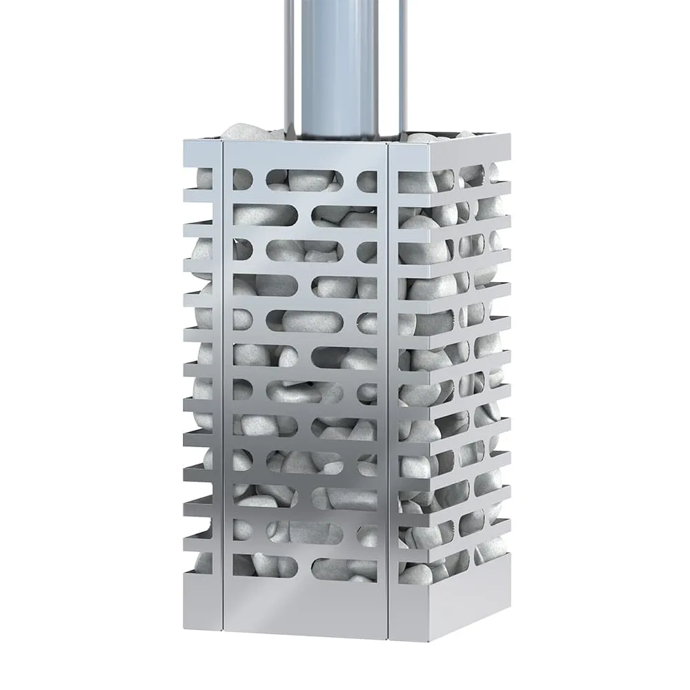 - Сетку устанавливают на заполненную камнями печь Астон. После установки промежуток между каменкой и сеткой заполняют камнями для бани средней фракции.