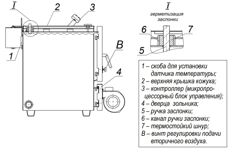 Блок управления обеспечивает поддержание установленной температуры через включение вентилятора. Вентилятор включится, когда температура снизится, и выключится, когда температура повысится. Автоматическое включение насоса системы отопления, когда будет достигнута температура включения насоса. Автоматическое включение вентилятора и насоса, когда закончится топливо в котле.