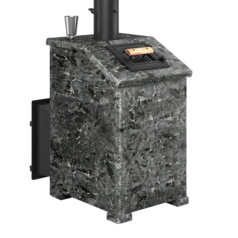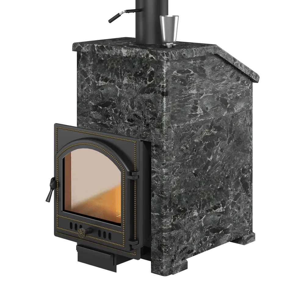Облицовка из натурального камня смотрится оригинально и способна существенно преобразить интерьер вашей бани. Дверца со стеклом позволит наслаждаться пламенем.