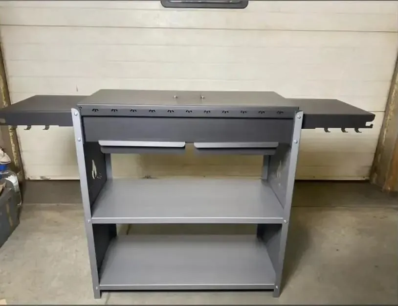 Порядок и доступность: две стационарные полки и выдвижные ящики позволяют удобно организовать хранение топлива, инструментов и аксессуаров, поддерживая чистоту в зоне готовки.