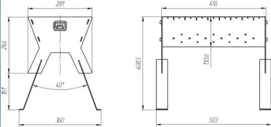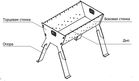 Отверстия в боковых и торцевых стенках обеспечивают оптимальный приток воздуха для поддержания горения и жара углей. Опоры позволяют менять высоту мангала и выбрать наиболее удобный вариант.