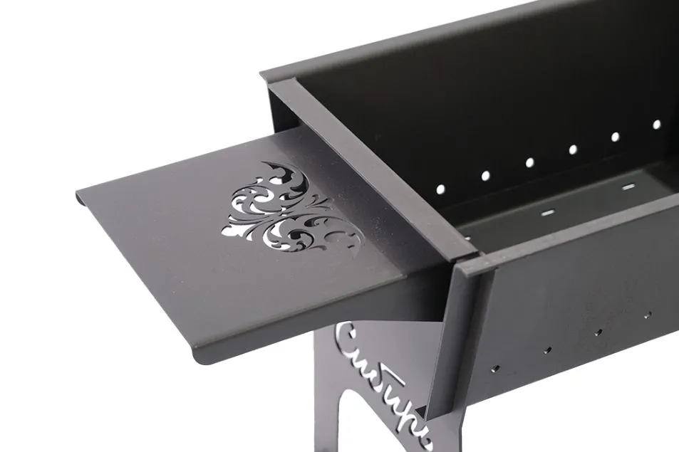Полки являются съемными и легко крепятся к мангалу с помощью специальных пазов и не требуют использования каких-либо инструментов, что особенно важно для сохранения удобства и мобильности изделия.