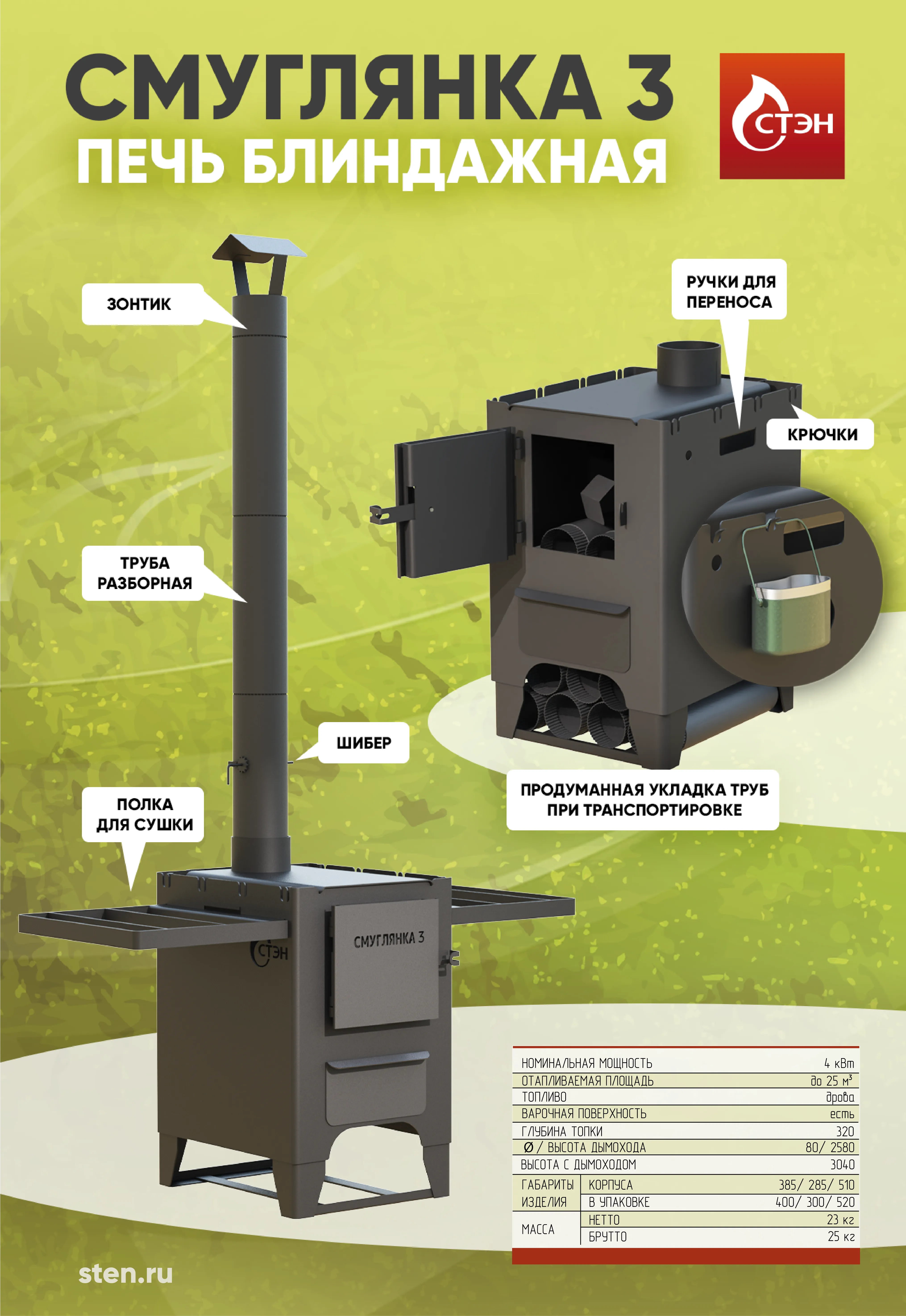 Печи Смуглянка предназначены для отопления стационарных и передвижных объектов в походных условиях: блиндажей, палаток, кунгов, а также небольших домов