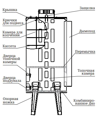 Устройство оснащено подвесами для крепления продуктов копчения или крепления кассеты для копчения рыбы
