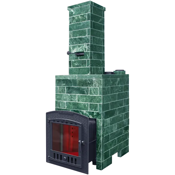 Расположенные по краям облицовки заливные горловины для поддачи воды декорированы каменными хомутами, которые могут быть выполнены в цилиндрической или восьмигранной форме по Вашему выбору. Змеевик - горная порода, добываемая на Урале. Красивый внешний вид с зеленоватым оттенком, хорошо поддаётся полировке и уходу за поверхностью. Имеет отличные теплофизические свойства.