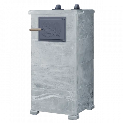 Облицовка закрывает корпус топки со всех сторон, имеет выходы для топливника, дымоходной трубы и подкидной дверцы. Талькохлорит – самый распространённый и широко известный камень, применяемый для облицовок печей и отделок парных помещений. Место добычи – Карелия. Используются слебы только из нижних горизонтов, обладающие повышенным качеством камня.