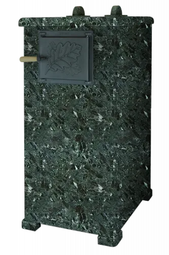 Облицовка закрывает корпус топки со всех сторон, имеет выходы для топливника, дымоходной трубы и подкидной дверцы. Серпентинит – горная порода, обладающая темно-зеленым оттенком с эффектом псевдоирризации – при направленном свете даёт красивый кристаллический блеск. Место добычи Карелия.