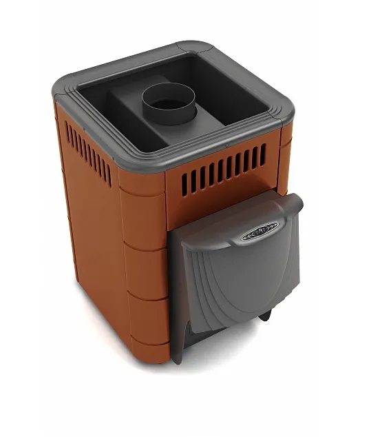 Центральное расположение дымохода значительно упрощает монтаж печи. Вентилируемая каменка способствует быстрому нагреву камней.
