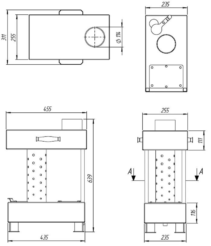 Печь изготовлена из листового металла толщиной 3 мм и окрашена термостойкой эмалью, что делает ее надежной и долговечной при эксплуатации.