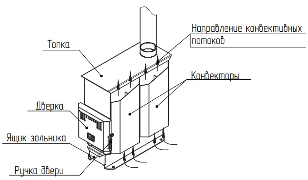 Удобный быстрый монтаж - лёгкий вес печи, не нужен фундамент. Компактный размер, легко транспортировать. Выход дымохода вверх