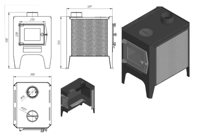 Рисунок 1. Общий вид и габариты отопительной печи