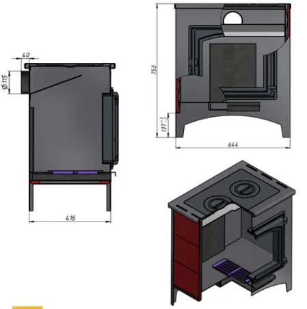 Печь оснащена варочной поверхностью с двумя чугунными конфорками для приготовления пищи. Печь укомплектована чугунным колосником и чугунной негерметичной дверцей с жаростойким стеклом. Печь облицована керамической плиткой для лучшего распределения тепла.