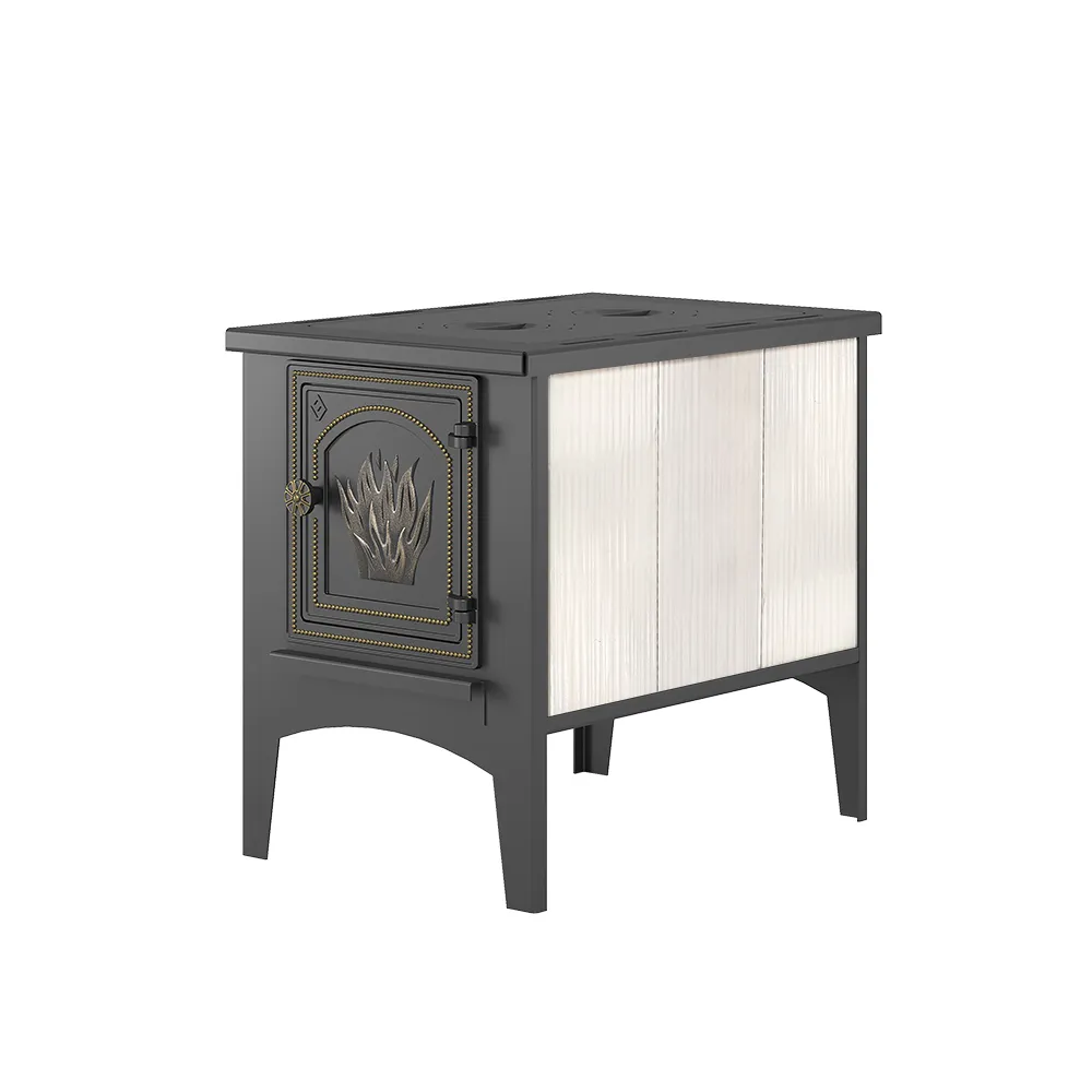 Печь оборудована двумя чугунными конфорками для приготовления пищи. Печь укомплектована чугунным колосником и чугунной негерметичной дверцей. Печь облицована керамической плиткой для лучшего распределения тепла.