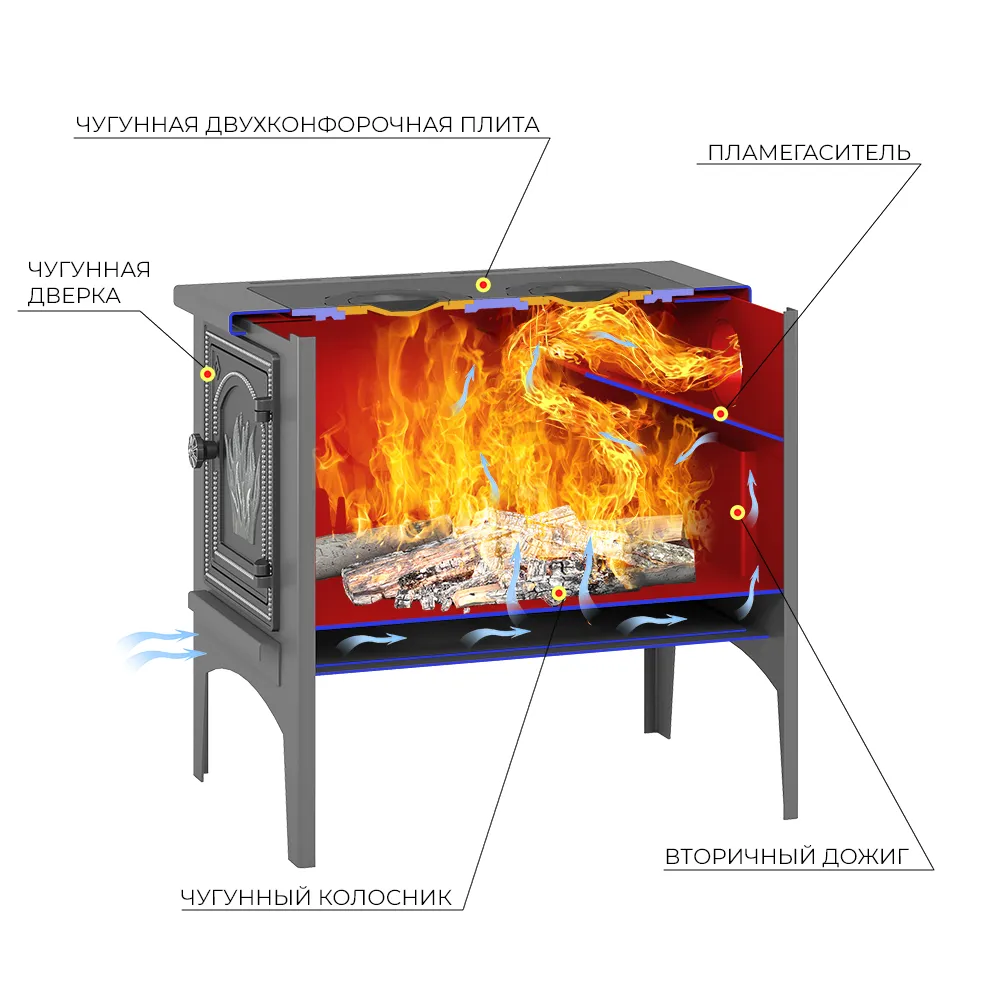 Печь оснащена двумя чугунными конфорками для приготовления пищи.