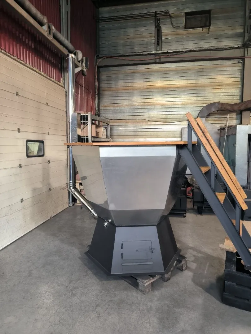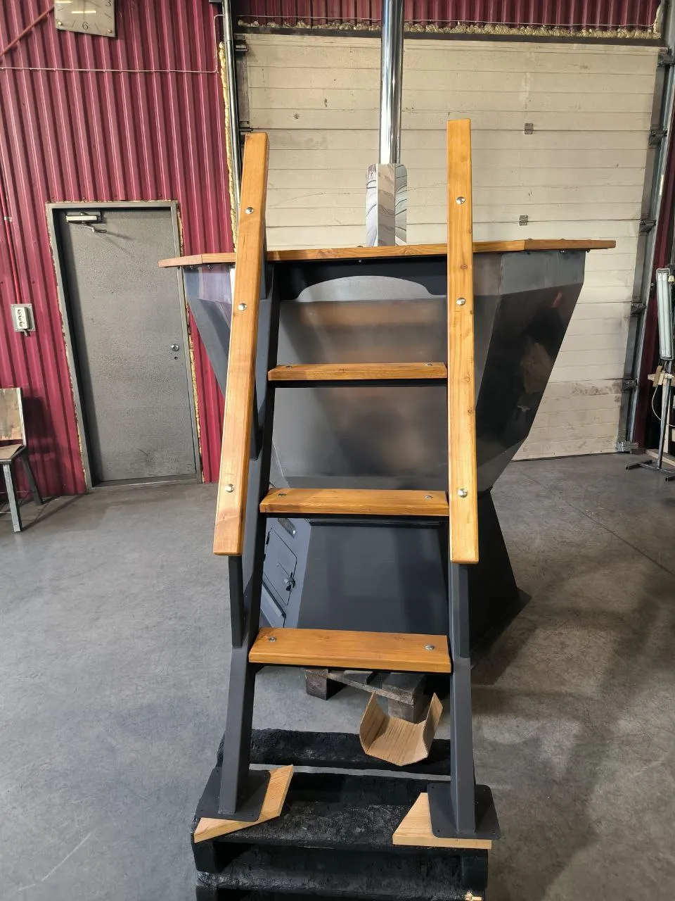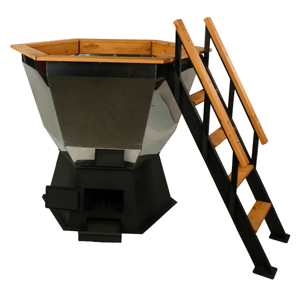 Объём чана составляет 1000 литров — достаточно для комфортного размещения 3–4 человек. В комплекте поставляется: печь, дымоход и лестница — всё необходимое для быстрой установки и начала использования.