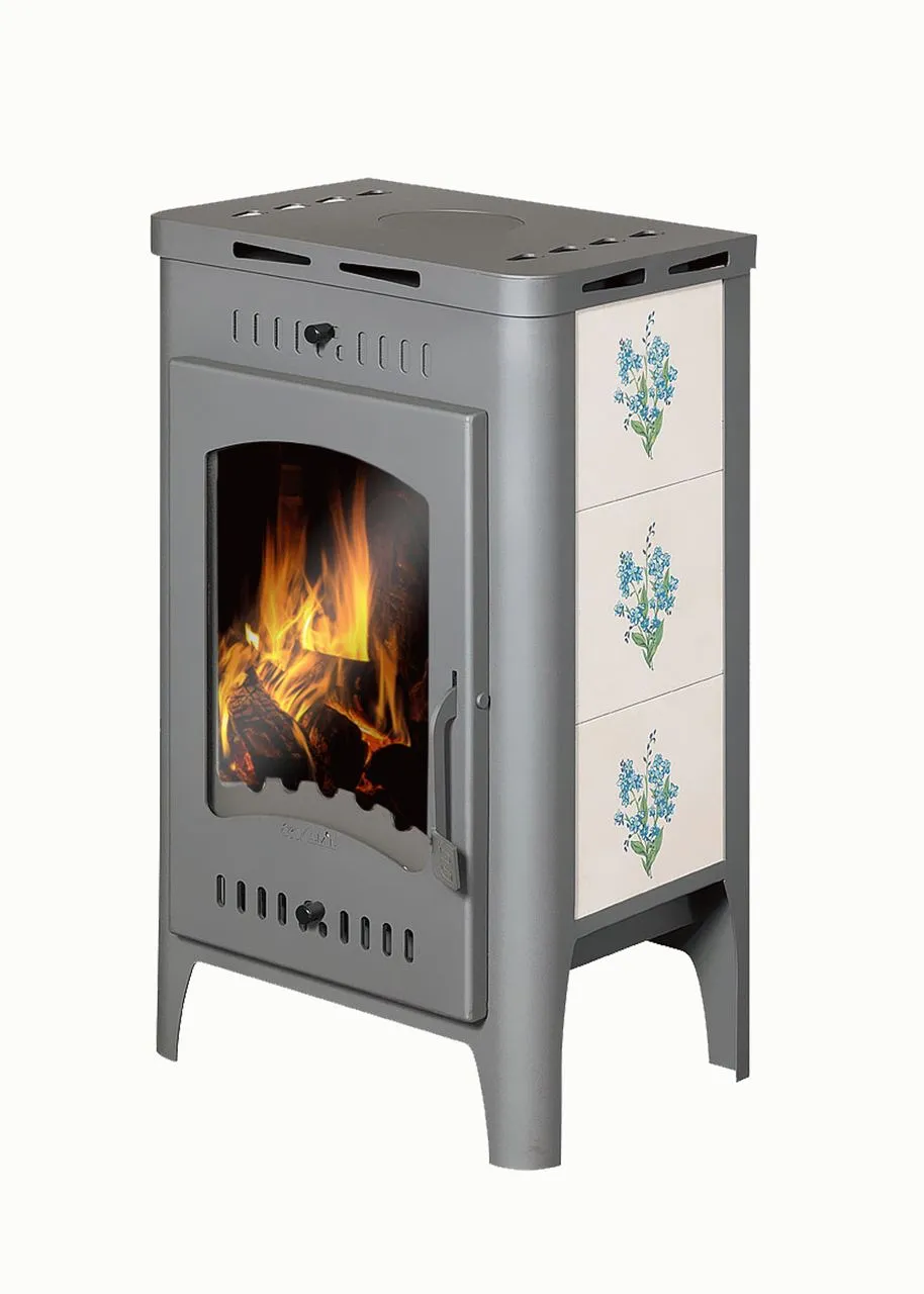 Корпус печи-камина Бавария Оптима выполнен из стали и облицован декоративной керамикой. Стальные печи быстро прогревают воздух в помещении. Начинают давать тепло уже через 15 минут после растопки. Термостойкий материал внутри топочной камеры - шамот. Он принимает основную температурную нагрузку. Боковые стенки украшены изображениями незабудок