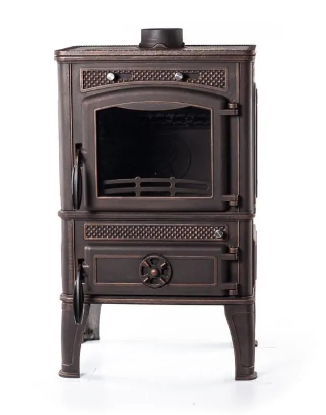 Конструкция оснащена вместительной чугунной топкой с огнеупорным стеклом на дверце (до 700 °C), системой защиты от копоти, колосниковой решеткой с механизмом сброса золы и выдвижным зольным ящиком. Внутри предусмотрены чугунные отбойники, защищающие стенки от перегрева. Реализована возможность верхнего или заднего подключения дымохода. Печь поддерживает режим длительного горения, а модификации отличаются наличием варочной панели или крышки для прочистки.