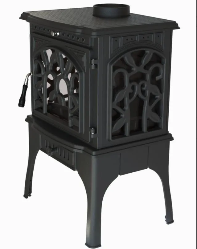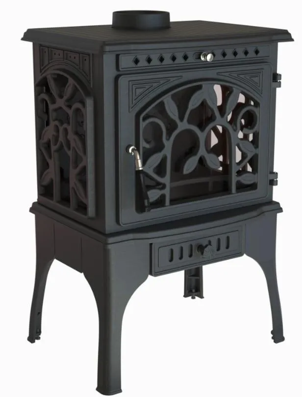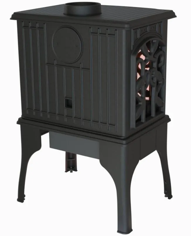 Конструкция оснащена вместительной чугунной топкой с огнеупорным стеклом на дверце (до 700 °C), системой защиты от копоти, колосниковой решеткой с механизмом сброса золы и выдвижным зольным ящиком. Внутри предусмотрены чугунные отбойники, защищающие стенки от перегрева. Реализована возможность верхнего или заднего подключения дымохода. Печь поддерживает режим длительного горения, а модификации отличаются наличием варочной панели или крышки для прочистки.