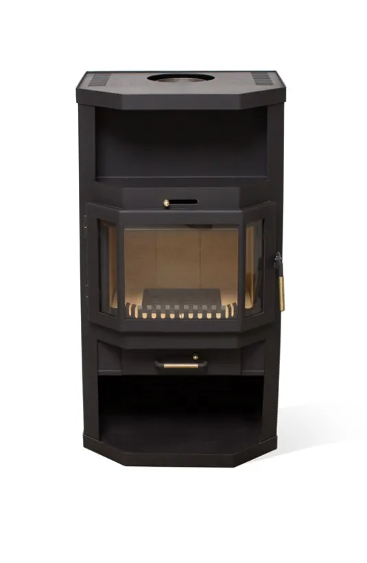 Печь оснащена призматической дверцей с панорамным обзором из трёх термостойких стекол высотой 330 мм. Внутри расположена просторная камера сгорания, защищённая шамотной футеровкой, с возможностью загрузки дров длиной до 50 см. Система "чистое стекло" предотвращает загрязнение стеклянной поверхности за счёт обдува тёплым воздухом. Предусмотрены два регулятора — для подачи воздуха на горение и на стекло. Внизу расположена вместительная ниша для хранения дров, а под топкой — зольный ящик с ручкой. Печь поддерживает длительный режим горения и может функционировать с антифризом при условии совместимости с другими элементами системы.