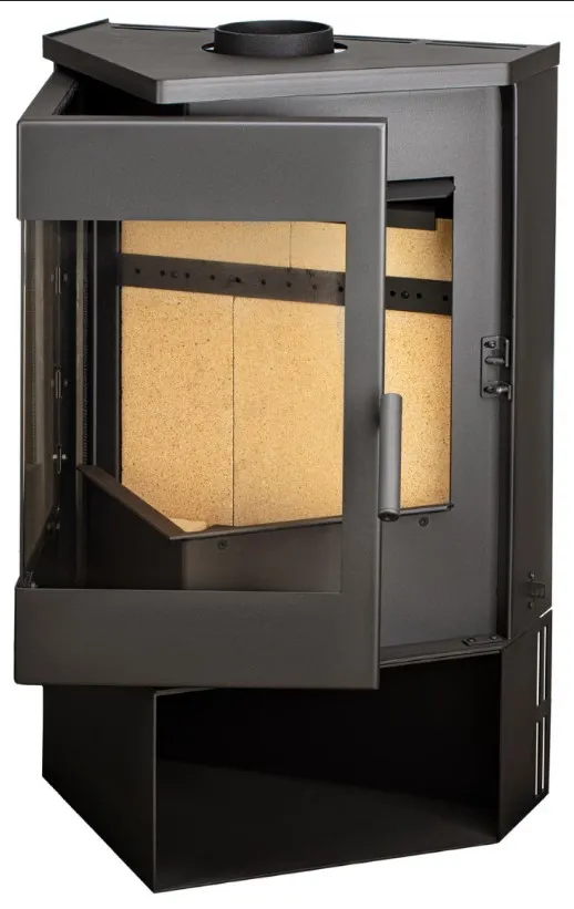 Наряду с лучистым теплом через прозрачное стекло дает преимущественно (до 70%) конвекционного тепла. Печь-камин оснащена всеми современными характеристиками: система воздушной очистки стекла, система вторичного дожига газов, система подачи воздуха из «вне», возможность подключения дымохода сверху либо сзади. Обзор огня с двух сторон. Печь-камин ЛеМан оборудована большой остекленной угловой дверкой. По своему желанию вы можете изменить сторону открывания двери (в комплект входит две ручки). Постамент печи также является универсальным и может быть установлен на левую либо правую сторону.