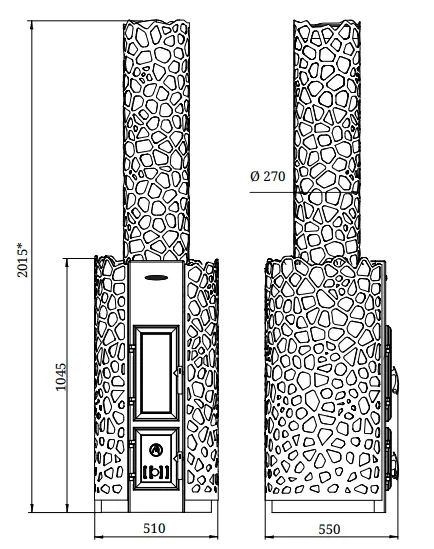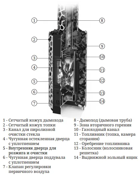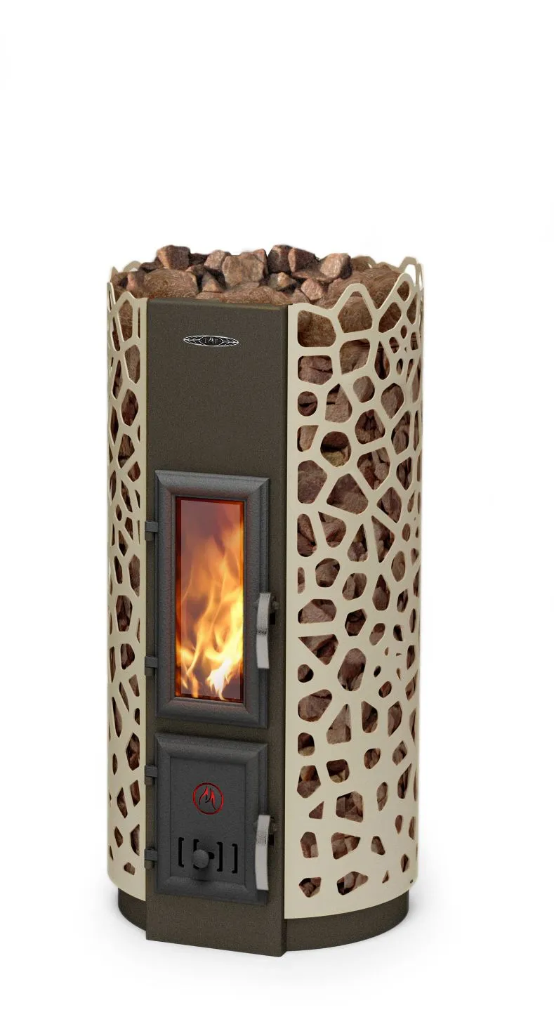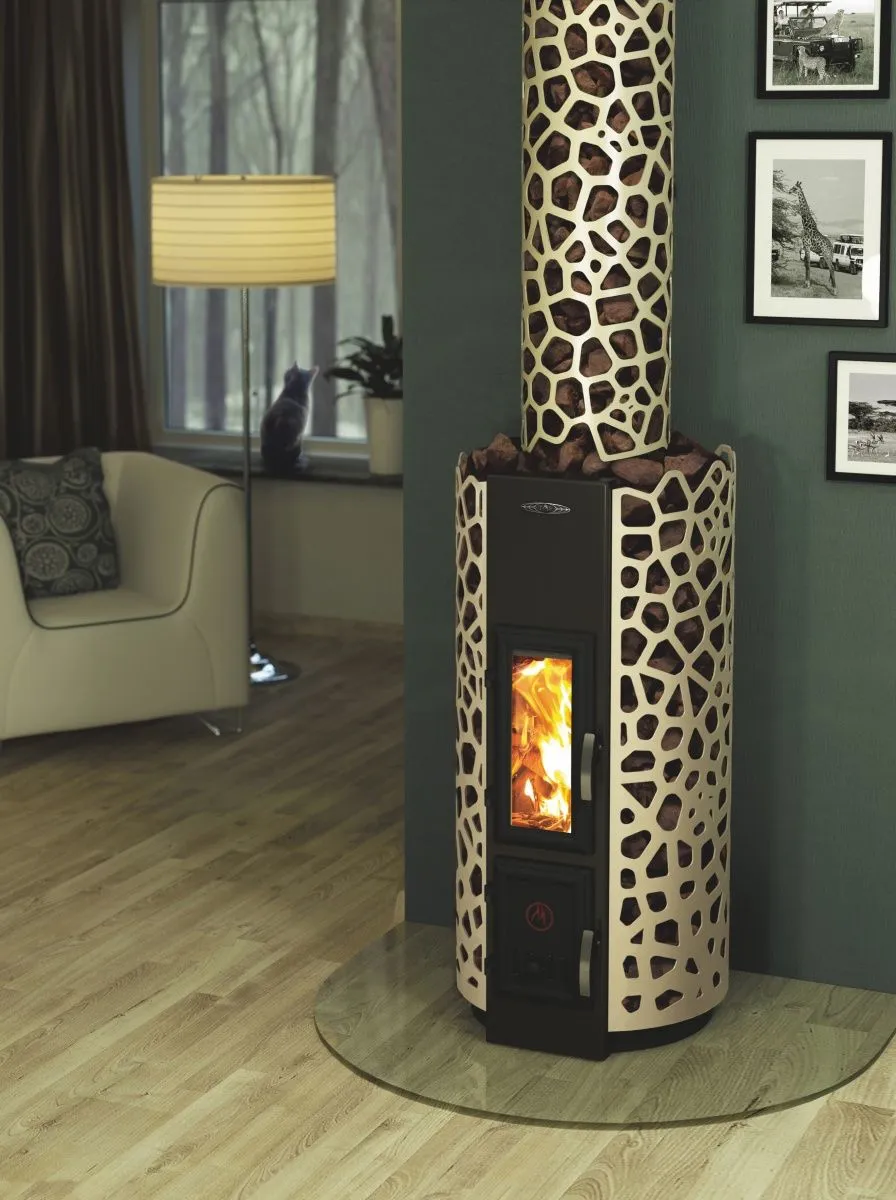 Камни долго держат тепло, хорошо экранируют сильное тепловое излучение от металлической топки и прекрасно нагревают воздух помещения естественной воздушной конвекцией через сетчатый кожух. Конструктив печи базируется на популярной модели печей-каминов «Статика Тетра». Со «Статикой» ее объединяет конструкция вертикально ориентированной топки. Сетчатые кожухи для печи и дымохода, вырезаны из цельных листов стали толщиной 3 мм и обладают достаточной прочностью и жесткостью, чтобы надежно и без деформаций удерживать закладку камней. В сетчатый кожух печи помещается до 140 кг камней, в кожух дымохода – до 80 кг.