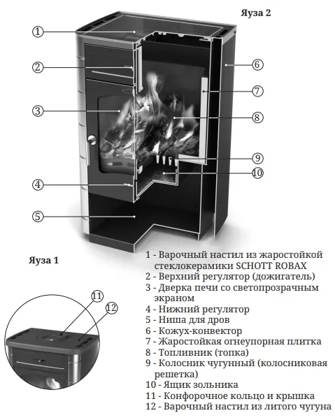 Дровяная отопительно-варочная печь-камин «Яуза» предназначена для экономичного воздушного отопления жилых помещений объемом до 150 м3, а также для приготовления и разогрева пищи. Печь сочетает в себе эффективный отопительный прибор, удобную варочную печь и красивый камин. Варочная поверхность вмещает несколько единиц посуды. Футерованная топка позволяет использовать «Яузу» в режиме интенсивного горения. Герметичная дверца дает возможность эксплуатировать печь в режиме длительного горения.
