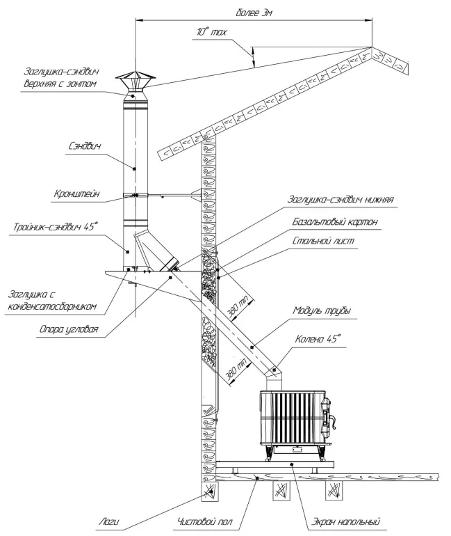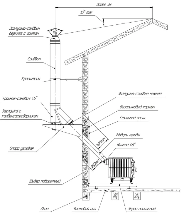 Рисунок 3. Схема установки печи с защитным экраном (монтаж дымосборника сверху)