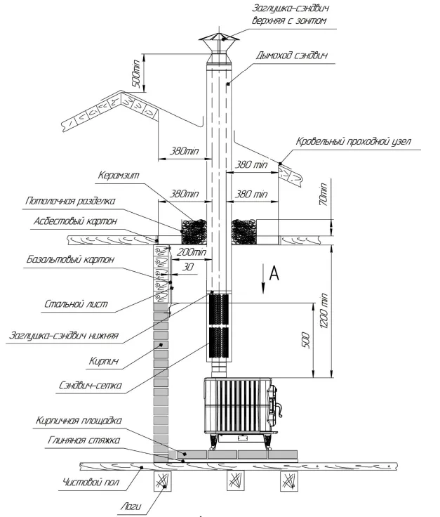 Рисунок 2. Схема установки печи с кирпичной кладкой (монтаж дымосборника сверху)