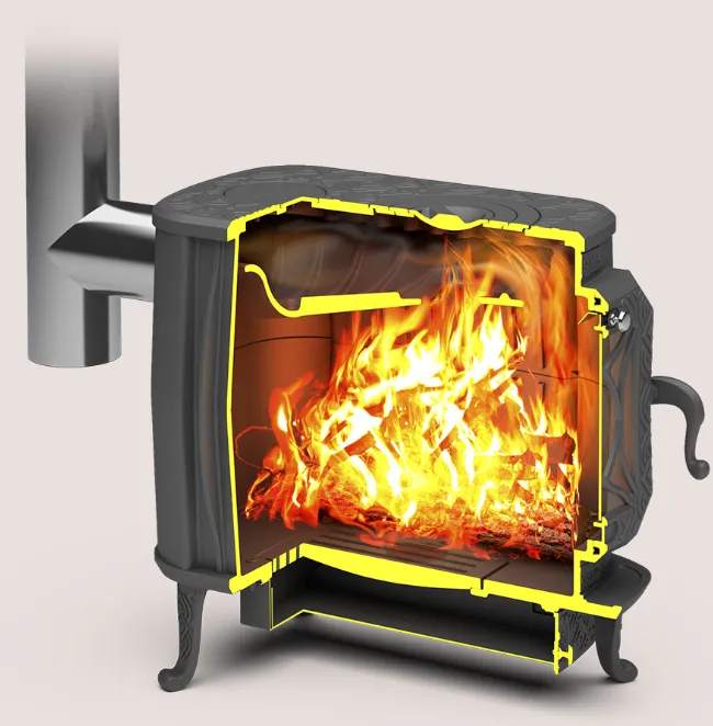 Уникальная конструкция топки, а именно сквозное оребрение (рёбра проходят насквозь топки изнутри наружу), что значительно увеличивает теплопередачу. Чугунный пламяотбойник уникальной формы обеспечивает оборот топочных газов, а вторичная подача воздуха их дожигание, что позволяет добиться высокого КПД печи (около 70%).