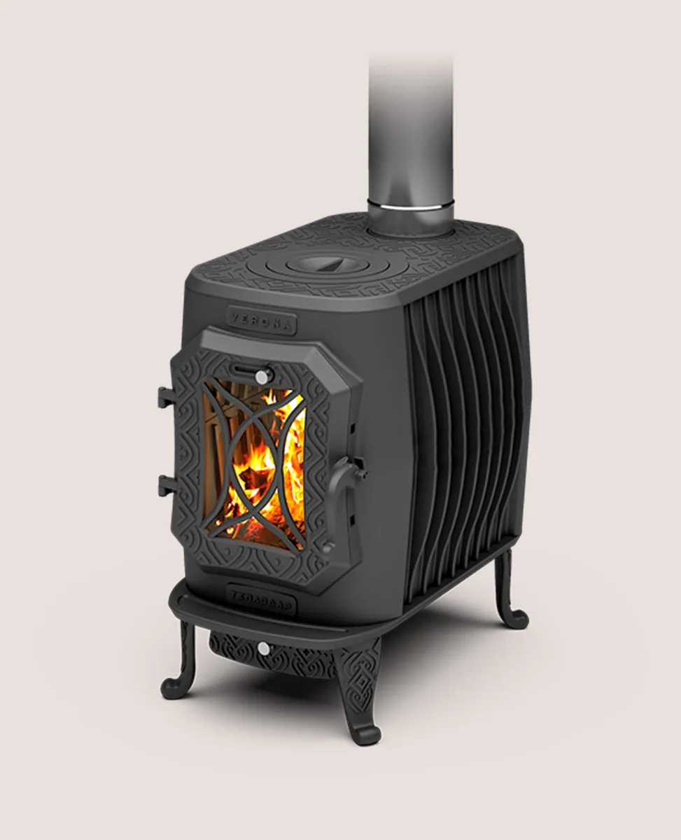 Интерьерная чугунная отопительная печь Verona предназначена для отопления помещений общим объёмом до 200 м³. В качестве топлива используются дрова длиной до 540 мм или древесные топливные брикеты.