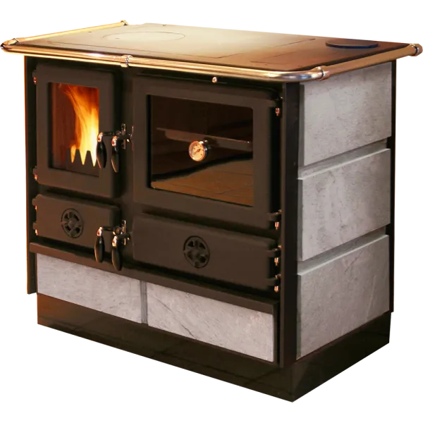 Печь-камин MAGNUM PLUS 4D L S (с камнем) (правая)- дровяная кухонная плита предназначена для отопления небольших дачных домов и приготовления пищи. Печь изготовлена из чугуна и эмалированной стали. Эмалированное покрытие обеспечивает продолжительный срок службы печи и отвечает за эстетичный внешний вид. Печь укомплектована большой чугунной варочной поверхностью с одной конфоркой и стальным эмалированным духовым шкафом для приготовления пищи. Духовой шкаф габаритами 270х350х470мм оснащён протвенем и датчиком температуры. Топочная камера состоит из чугунных плит.