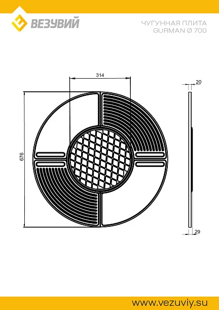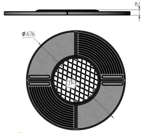 Чугунная плита Gurman Ø700 изготовлена из качественного чугуна, разрешённого для применения в пищевой промышленности. Рабочие поверхности плиты-сектора толщиной 10 миллиметров. Такая толщина предотвращает деформацию металла во время нагрева и готовки. Дополнительные рёбра жёсткости на нижней поверхности усиливают конструкцию и позволяют уменьшить общий вес плиты.