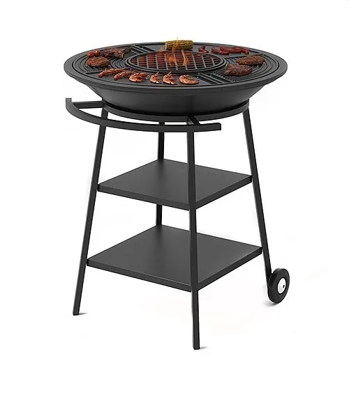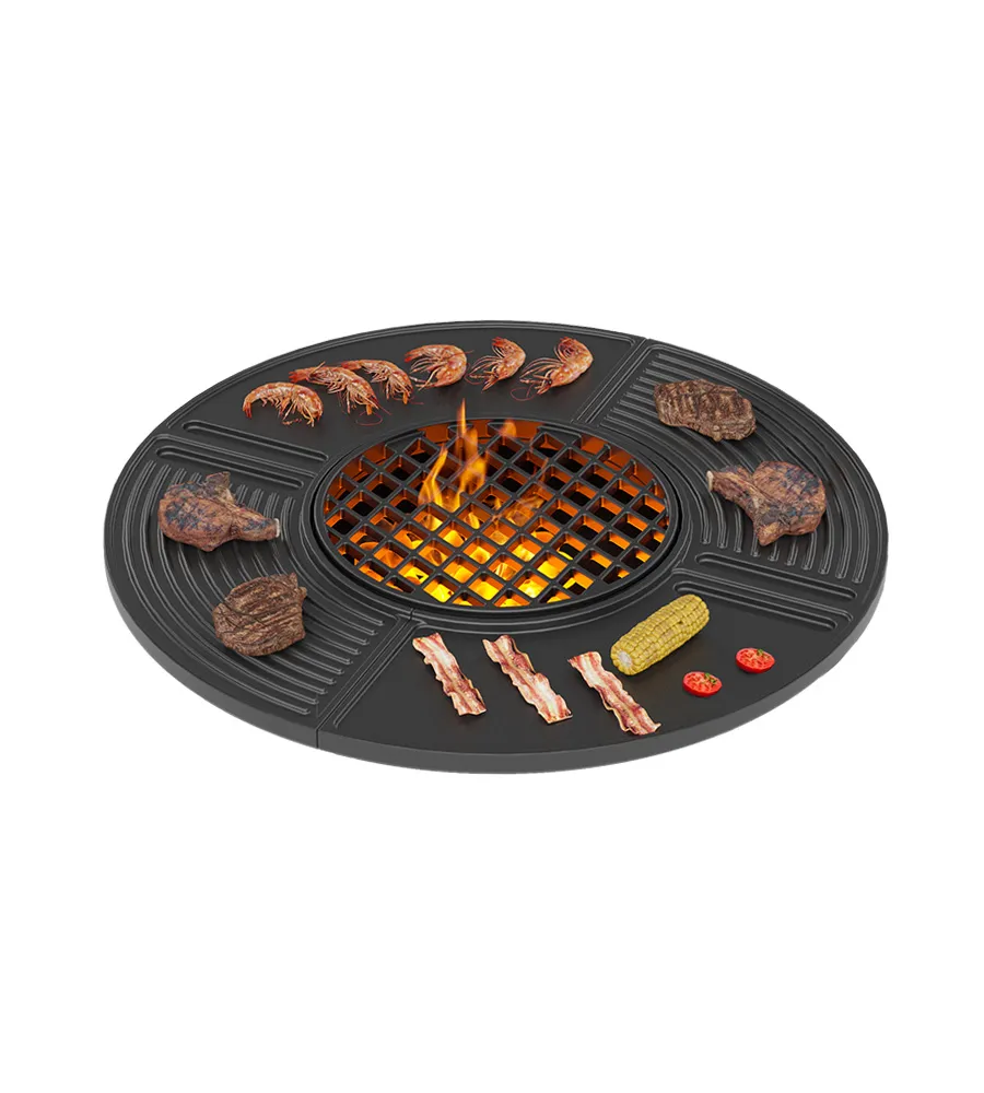 Небольшой бортик по краю плиты ограничивает рабочее пространство, предотвращает попадание жира в огонь и его возгорание. В середине плиты размещина чугунная решётка Везувий Стейк диаметром 314 мм. Эта решётка предназначена для готовки мяса и овощей с красивым диагональным рисунком. Дополнительные желоба, размещённые по середине каждого сектора плиты, предназначены для сбора излишнего жира или соков, выделяющихся при готовке продуктов. Наличие этих элементов в конструкции уменьшает количество жира на рабочей поверхности, позволяя готовить более полезную пищу.