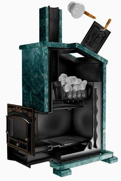 Комбинирование материалов позволяет заложить экономическую выгоду для конечного покупателя, а также значительно увеличить показатели эффективности и надежности печи, поскольку срок службы печи при правильной эксплуатации составляет 50 лет. Данная модель премиальной банной печи «Сибирь-25» в облицовке «Президент» (змеевик) выполнена без выносного топочного канала, что позволяет топить печь прямо в парном помещении. Небольшая топочная дверца выполнена из чугуна и оснащена термостойким стеклом.