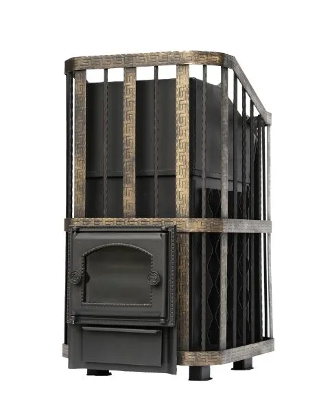 Премиальная банная печь «Сибирь-40» поставляется в комплекте с кованной сеткой для заклада камней и чугунной стартовой дымоходной трубой диаметром 130 мм. Кованная сетка для камней с аутентичным узором вмещает большую массу камней, что позволяет получить оптимальное соотношение температуры и влажности в парной, создать комфортный пар и атмосферу в парном помещении.