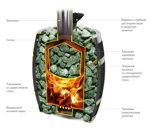 Большая масса закладываемых камней при компактных габаритах дает неоспоримое преимущество по теплоемкости перед стандартными металлическими печами-каменками.