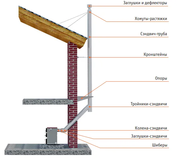 Устанавливается либо непосредственно на кольцо дымосборника печи, либо на модуль трубы дымохода. Стыковка с предыдущим и последующим элементом дымохода выполняется только по внутренней трубе