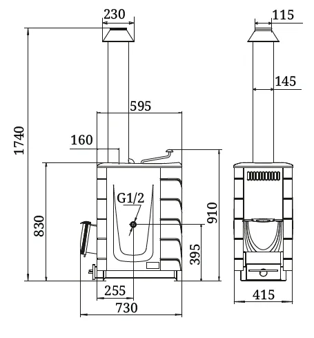 Топливник стал прямоугольным и более вместительным. Теперь он рассчитан на большую длину дров - до 50 см. Боковые и задняя поверхности топливника охлаждаются воздушной конвекцией. Печь получила встроенную невентилируемую каменку емкостью 20 литров, нагреваемую снизу излучением от пламени и сбоку конвекционным теплом уходящих горячих газов. Каменка позволяет резко поднимать влажность в парной для паровых акцентов.