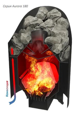 Эффективная схема прогрева камней и парильного помещения заключается в том, что топка имеет множество изгибов, теплоотводящих конструктивных элементов, что увеличивает площадь теплоотдачи. Также значительную роль играет конвекция воздуха между топкой печи, радиаторами и защитным кожухом