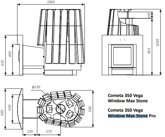 Стальная банная печь Cometa Vega 350 Window Max Stone (Серпентинит)