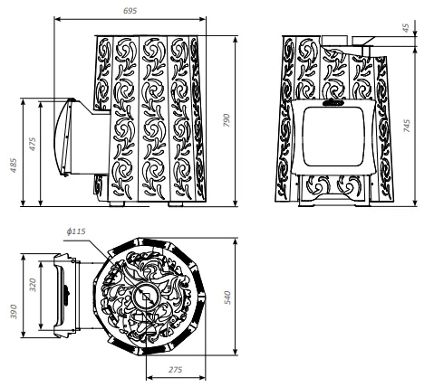 Стальная банная печь Violet Short Window Max – вызывает эмоции с первого взгляда, которые усиливаются в процессе эксплуатации. Блестящие боковые панели сверкают четкими гранями и подчеркивают ее эксклюзивность. Богатый внешний вид дополняют изящные узоры из Русских сказок и былин. Печь Violet призвана создавать неповторимую атмосферу Русской бани. От ее стенок исходит мягкое тепло, излучаемое выложенными по периметру печи полудрагоценными камнями.