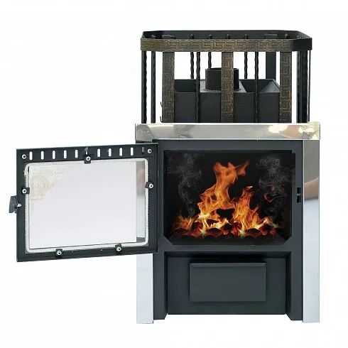 Панорамное стекло, диагональю 43 см, делает процесс топки завораживающим. Согласно народной поговорке человек безотрывно может смотреть на три вещи – на огонь, воду, и на то, как другие люди работают. Данная печь объединяет эти три вещи и сделает всё сама – и даст возможность смотреть на живой огонь через термостойкое стекло, согреет воду в баке, а также сделает обстановку в бане тёплой и комфортной. Эстетика камней наполнит парную уютом и создаст неповторимую атмосферу живого общения с природой в Вашей бане.