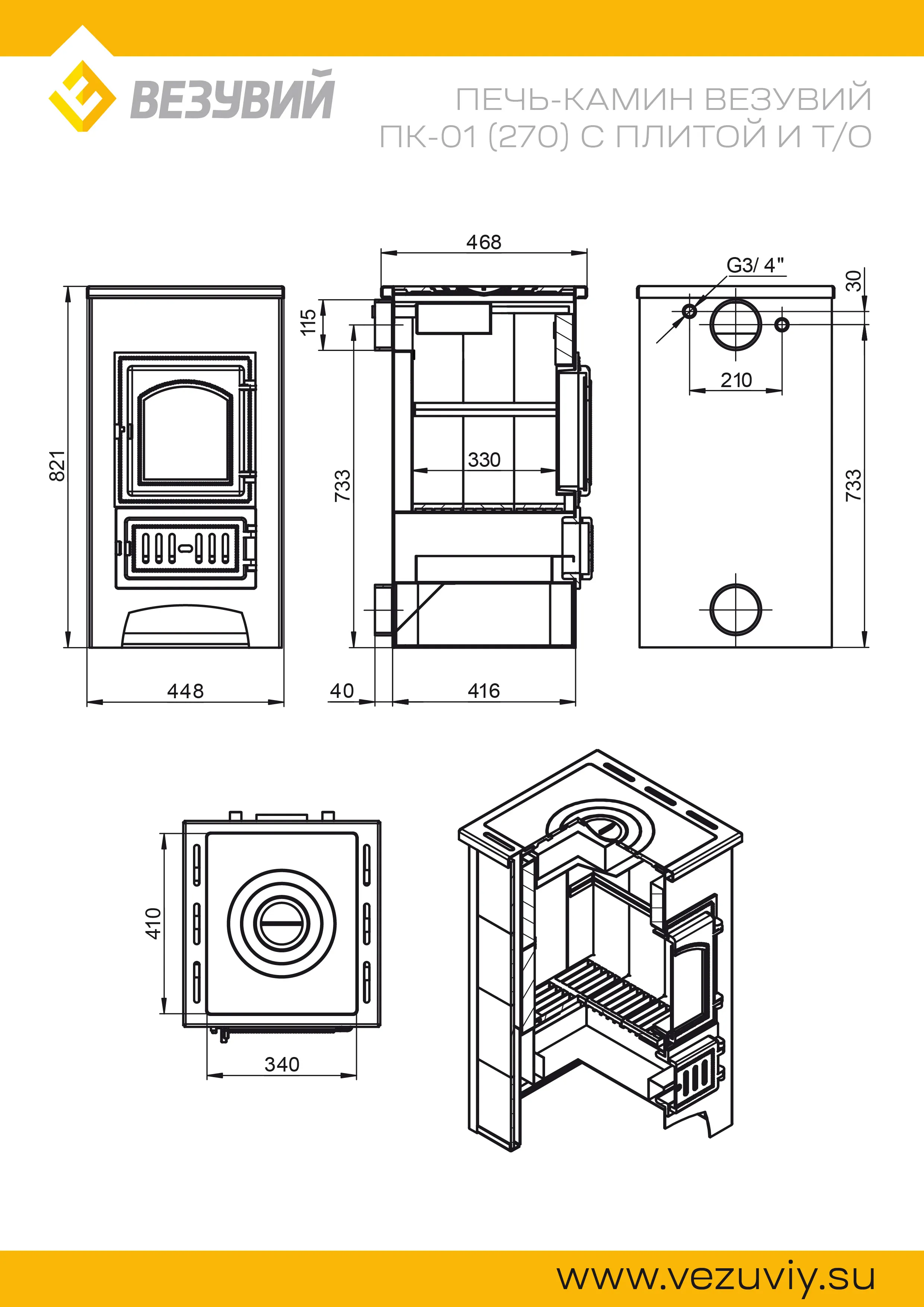 Основные характеристики Печи-Камина ПК-01 (270) с плитой и т/о 9 кВт (150 м3) Ø 115 мм