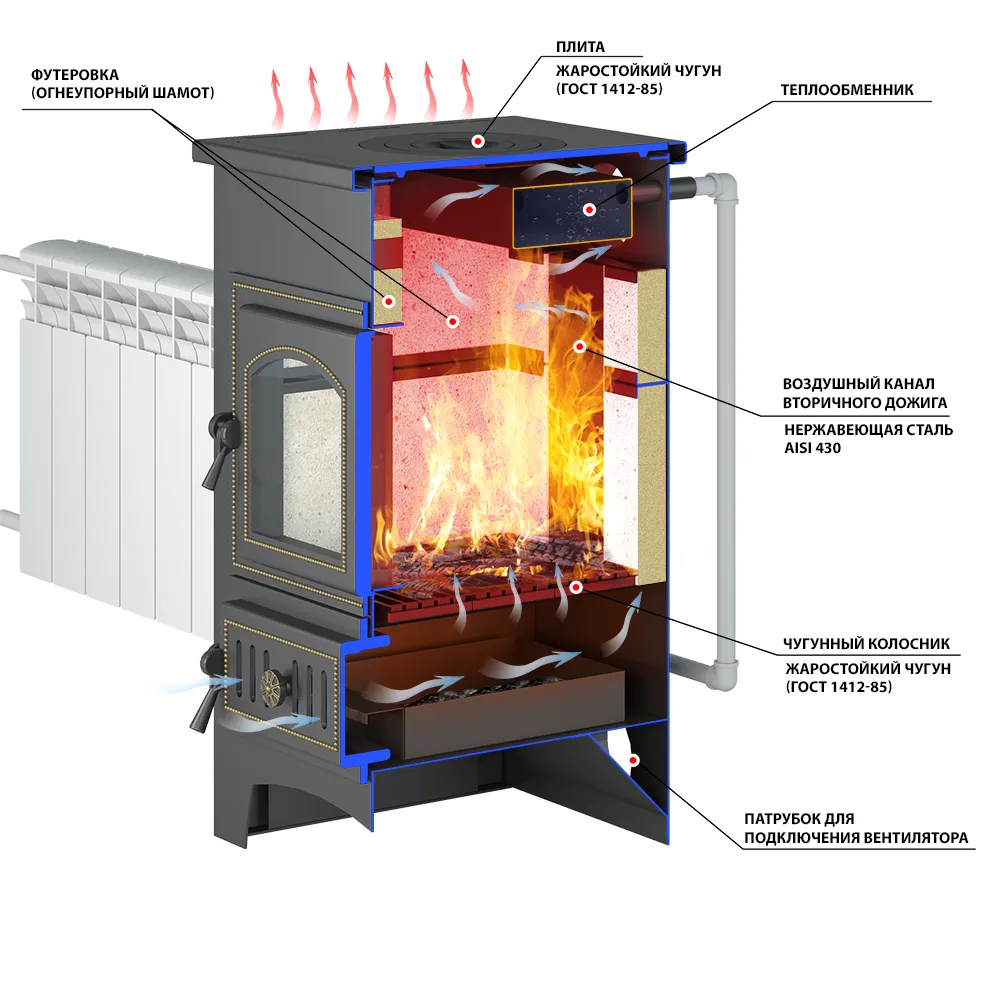 Возможность подключения электрического вентилятора, который обеспечивает "турбореактивный" разогрев помещения.