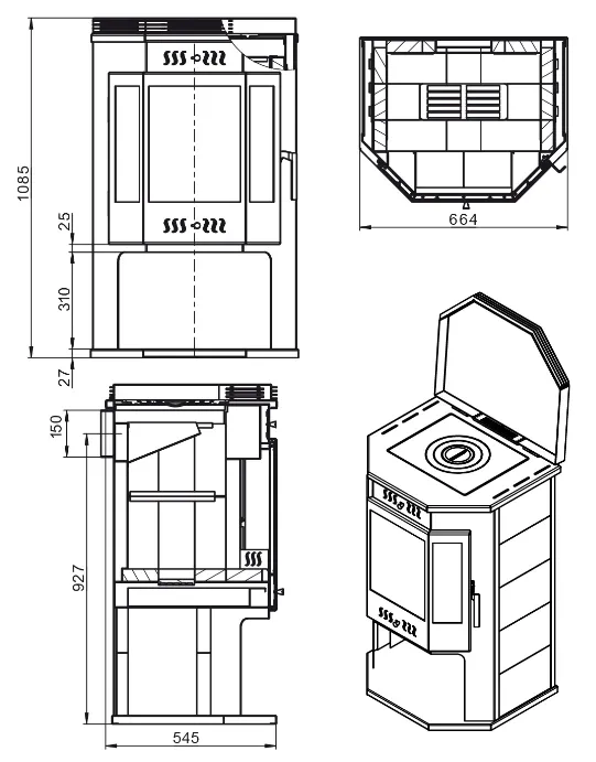 Топка в горизонтальной проекции имеет форму призмы, что позволяет размещать дрова как вдоль, так и поперёк топочного пространства.
