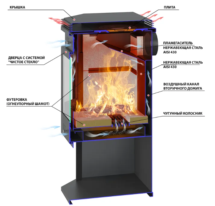 Над передним краем пламегасителя размещается П-образный профиль. Он дополнительно защищает самый термонапряжённый участок верхней панели топки от воздействия высокой температуры и прогорания. На задней стенке топочной камеры расположен канал для подачи воздуха на вторичный дожиг. П-образный профиль из нержавеющей стали толщиной 2 мм проходит из поддувала в верхнюю часть топки. В верхней панели топки размещается конфорка. Она предназначена для приготовления и разогрева пищи. Верхняя панель и конфорка закрываются большой крышкой, покрывающей всю площадь верха печи.