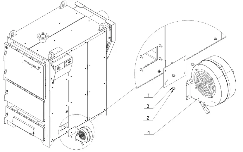 1.Заглушка, 2.Гайка М6, 3.Шайба М6, 4.Вентилятор наддува,