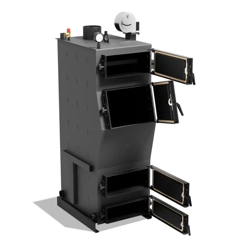 Универсальность конструкции позволяет использовать котел как в открытых системах отопления, так и в закрытых. Современная автоматика регулирует температуру на выходе из котла, а возможность дооснащения турбо-автоматикой делает его автономным после загрузки топлива.